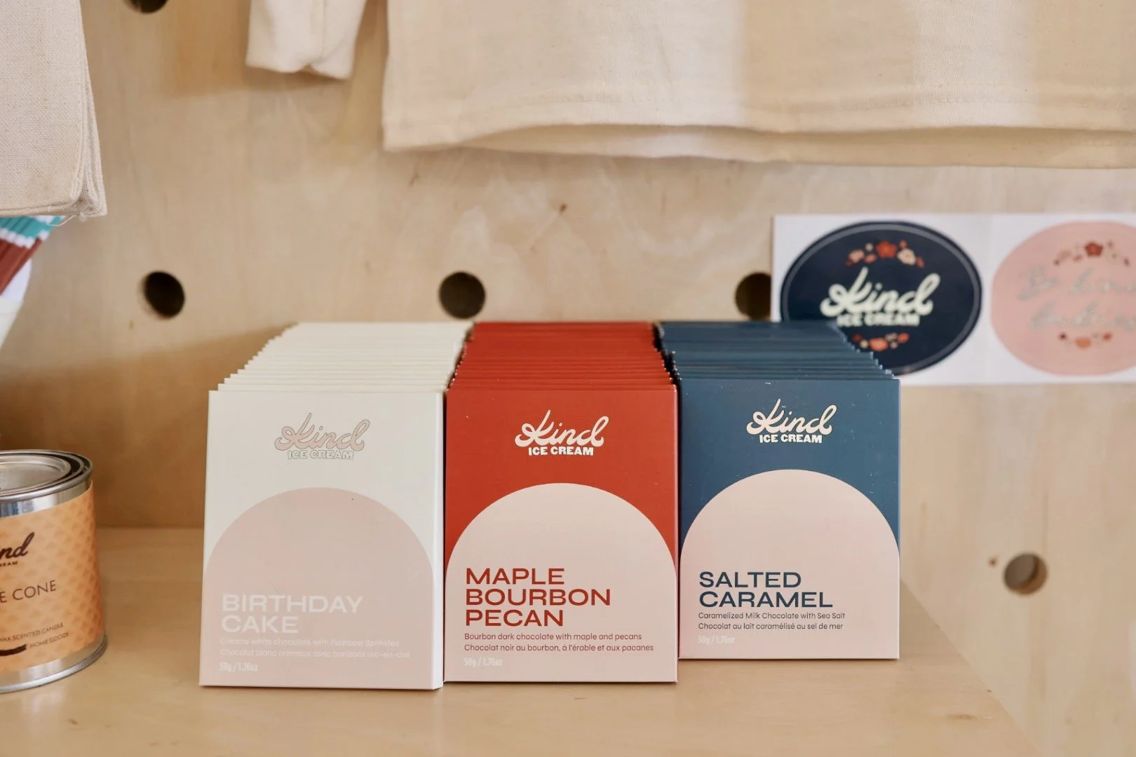These custom branded chocolate bars for Kind Ice Cream use playful colours and arches to create a sense of whimsy and reflect the brand identity Kind Ice Cream has carefully crafted.